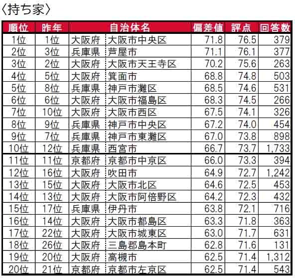 ●持ち家では、交通の利便性が高く、商業施設が集積する大阪市の中央区(1位)・天王寺区(3位)と、落ち着いた住宅街の兵庫県芦屋市(2位)、大阪市のベッドタウンの大阪府箕面市(4位)などが引き続き上位にランクインしています。