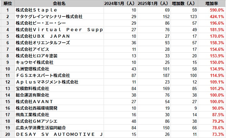 「誰もが活躍できる仕組みをつくる。」をミッションに掲げ、セールスチームの武器となるデータベース「SalesNow」を展開する株式会社SalesNow(本社:東京都渋谷区、代表取締役:村岡功規、以下「SalesNow」)は、国内550万社の企業情報を完全網羅した日本最大級のデータベース「SalesNow DB」より、広島県に本社を置く企業の2024年1月時点および2025年1月時点の従業員数データを分析し、従業員数増加率ランキングTOP20を発表しました。本ランキングは、各企業の成長スピードを可視化するものであり、新規雇用の創出や事業拡大の動向を明らかにしています。