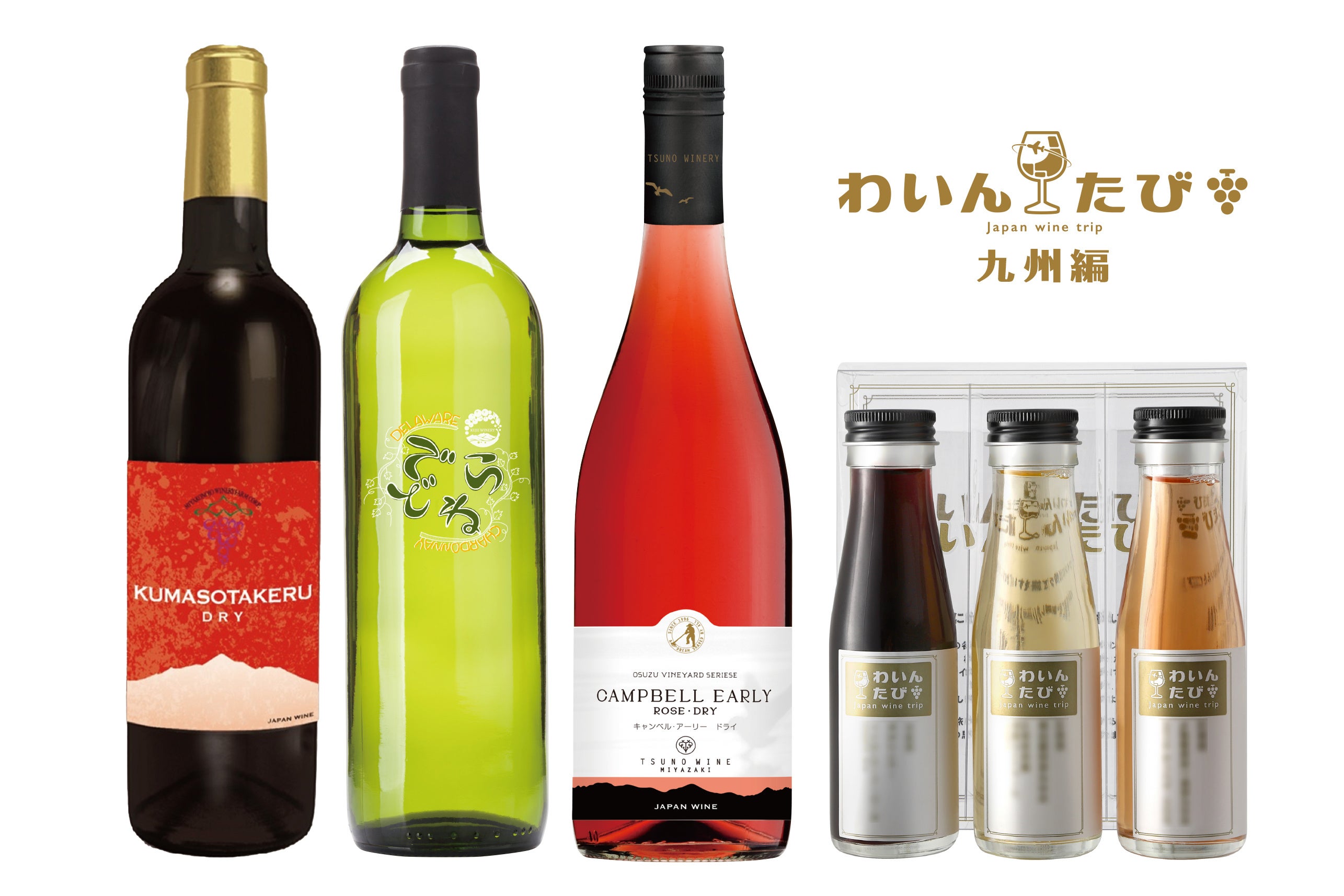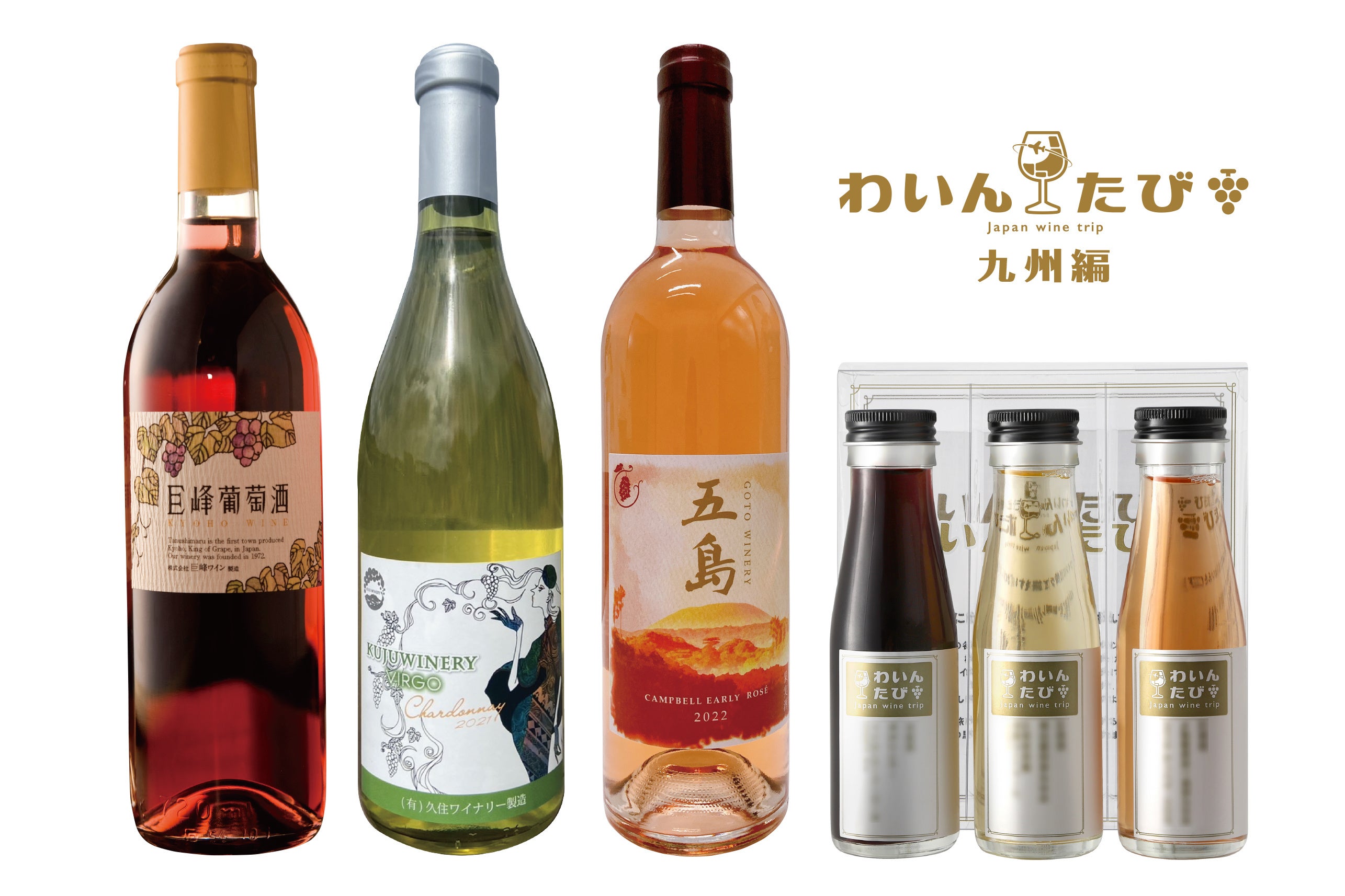 「わいんたび 九州編」は、全国的でも珍しい離島ワイナリーである長崎県・五島ワイナリーをはじめ福岡県・大分県・宮崎県の4県5ワイナリーによる赤・白・ロゼの3本セットを2つの商品ラインナップでご用意しました。【資料1ー1】