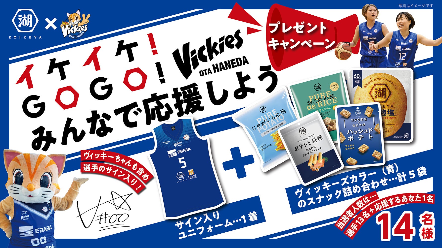 株式会社湖池屋(本社:板橋区/社長:佐藤章)は、チーム活動を支援している女子バスケットボールチーム「東京羽田ヴィッキーズ」とともに、選手の直筆サイン入りユニフォームと湖池屋のスナック菓子詰め合わせが当たる、「イケイケ!GOGO!ヴィッキーズ みんなで応援しよう プレゼントキャンペーン」を実施します。