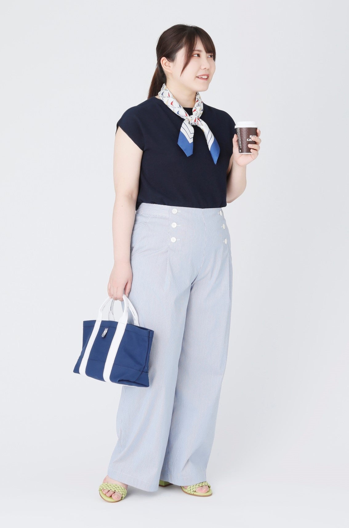 トレンドのワイドパンツは、ボリュームがある分トップスでバランス調整を。腰回りは隠さずにタックインすると、ウエストラインを高く見せてくれます。ノースリーブに抵抗のある方は、肩線が落ちたデザインのものを選ぶのがおすすめ!二の腕をさりげなくカバーしつつ、涼しげな着こなしが叶います。首元にスカーフをプラスすれば、目線が上がって更にすっきりとした印象に。