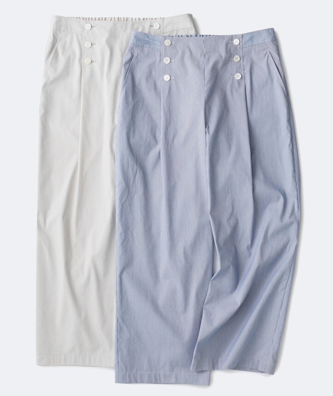 マリン風のフロントボタンがポイントのワイドパンツ。ストレッチ性があり、汗ばむ時期の着用に適した爽やかなコードレーン生地を使用しています。リラクシーな穿き心地で、トレンド感も叶うアイテムです。