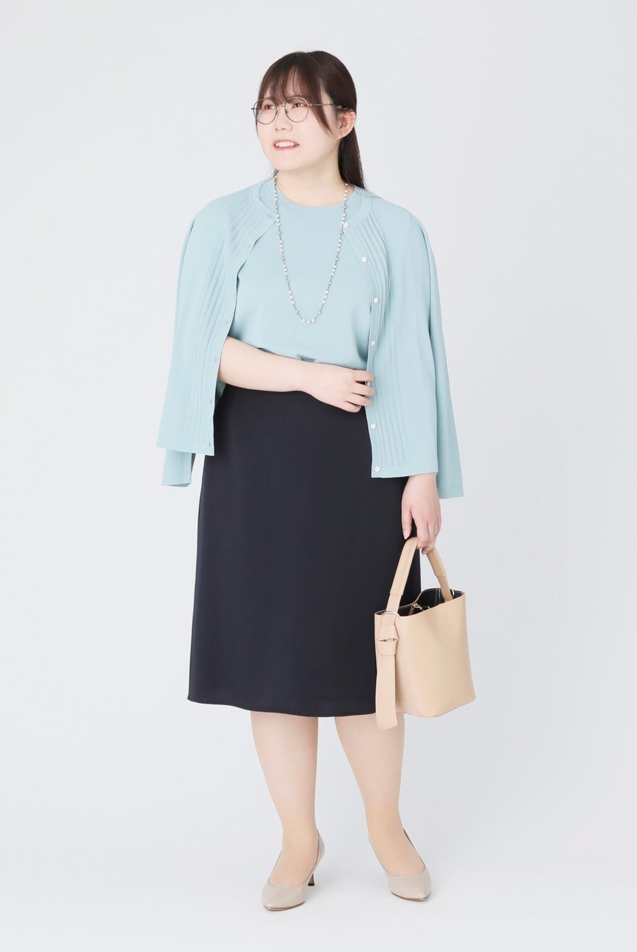 スカートは、身体にフィットしすぎず程よく広がるシルエットのセミフレアタイプをチョイス。膝が隠れる丈感で、レッグラインが美しく見える絶妙なバランスもポイントです。胸下まであるロングネックレスをプラスすれば、直線が生まれ顔周りをシャープに見せてくれます。