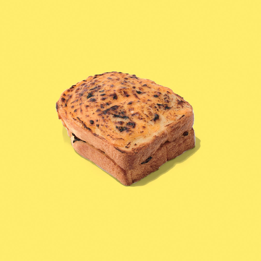 ハニー食パンに、春キャベツ・新玉ねぎ・ベーコンにアンチョビをきかせたフィリングを挟み、ベシャメルとチェダーチーズをトッピングして焼き上げました。