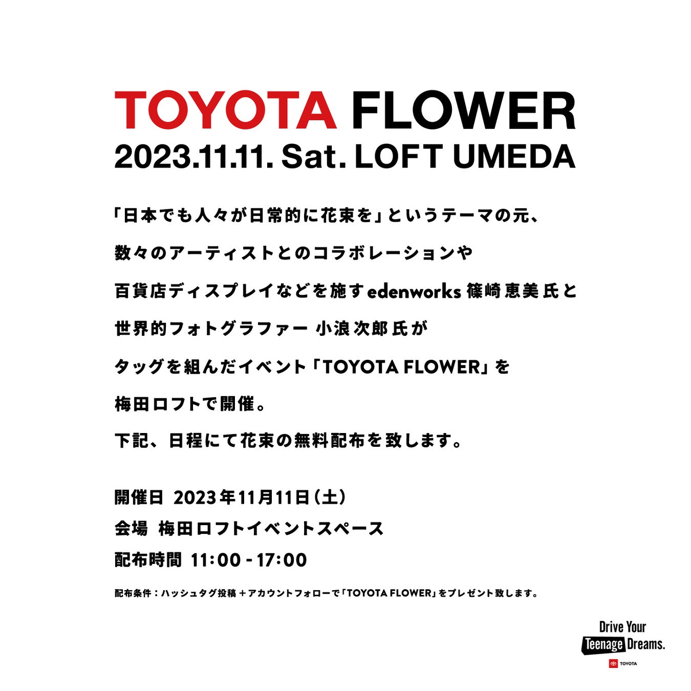 今回、2023年11月11日(土)に 梅田ロフトで開催される「TOYOTA FLOWER」に是非足を運んでいただき、会場での花束を通じて日常の小さな幸せや感謝の気持ちを共有し、日常に花束を贈る楽しさや温かさを感じて頂きたい。