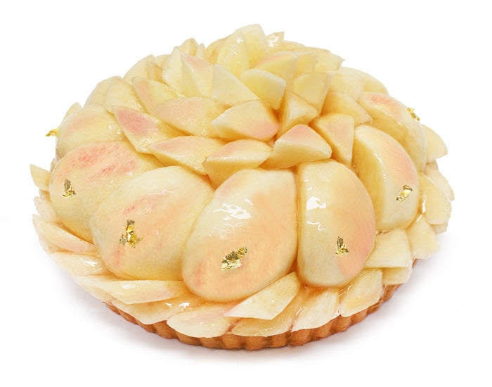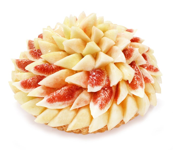 果汁たっぷりの桃と独特な食感のいちじくをあわせて、美しく飾り付けました。コクのあるカスタードクリームのベースと共に楽しめます。〈ベース:カスタードクリーム 価格:1,300円(税込)/1ピース〉