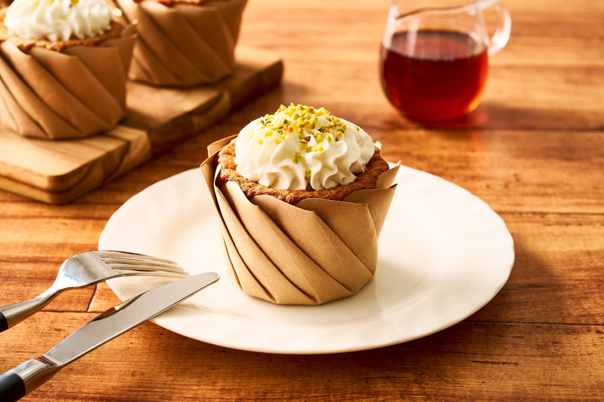 「メープルシフォンケーキ」はメープルが上品に香る、ふんわりとした優しい口どけのシフォンケーキです。生クリームとピスタチオをトッピングし、彩りも豊かに仕上げました。