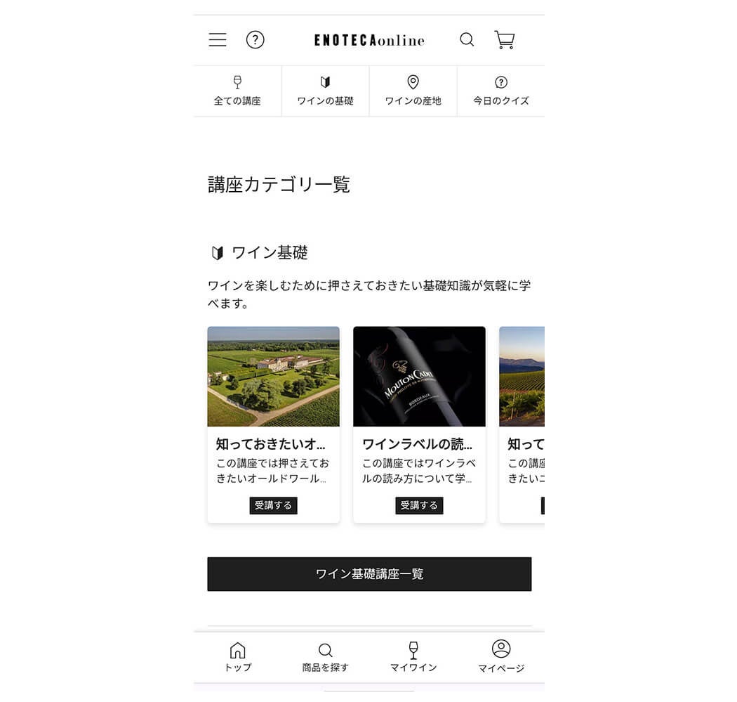 これまで提供してきた「産地講座」に加え、今回のリニューアルで「ワインの基礎講座」と「今日のワインクイズ」を新たに導入します。これらのコンテンツは、クラブエノテカへの会員登録や公式モバイルアプリへのログインなしで利用できます。