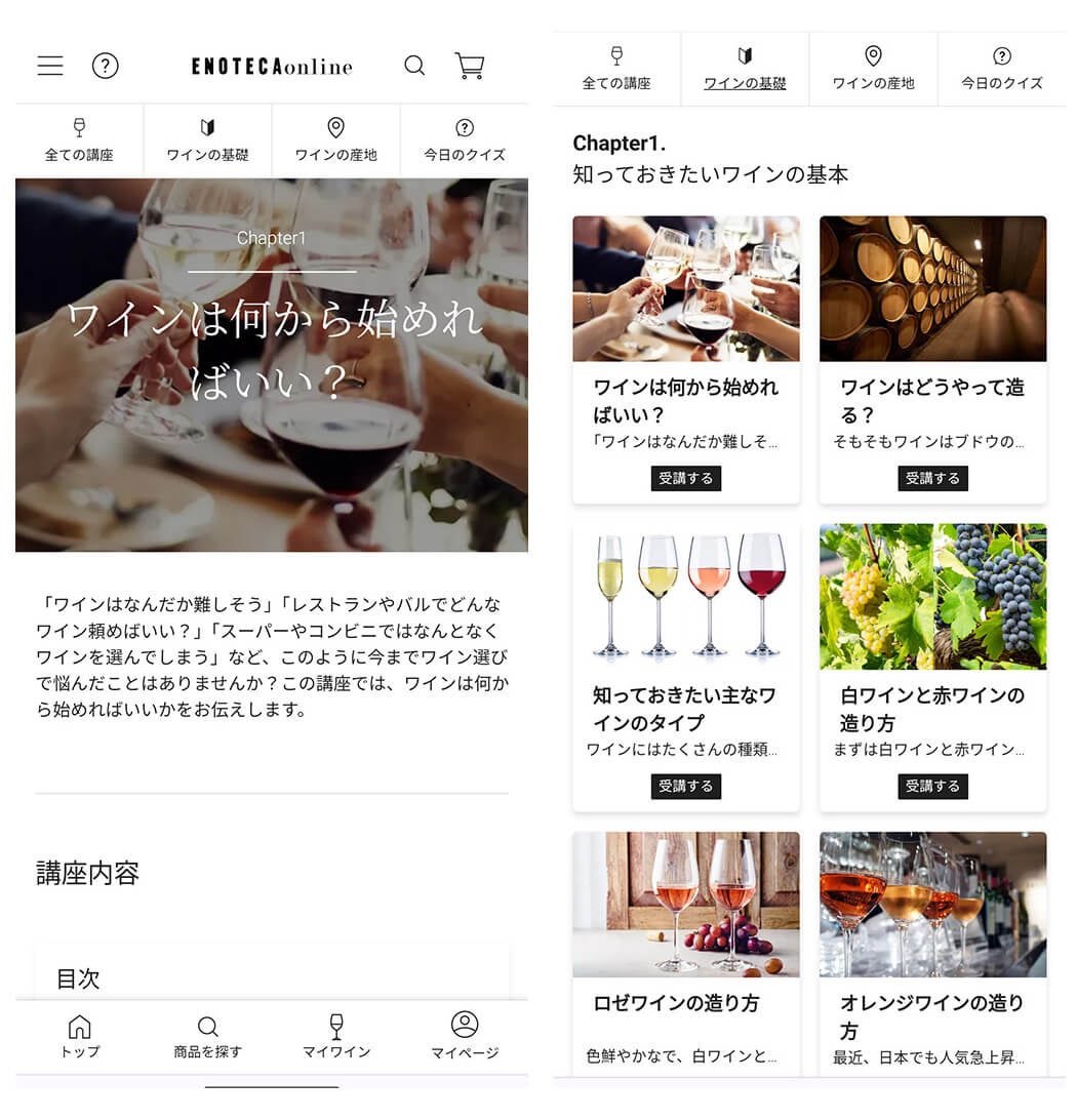 「基本のブドウ品種」や「レストランでのワインの楽しみ方」、「ワインと料理を合わせてみよう」など、ワインの基礎知識を学べる講座です。30を超える講座があり7つのチャプターから構成されています。初心者の方でも理解しやすい内容で、ワインについてのさまざまな「知りたい」を満たします。また講座で学んだ内容の習熟度を確認できるワインクイズも用意しています。