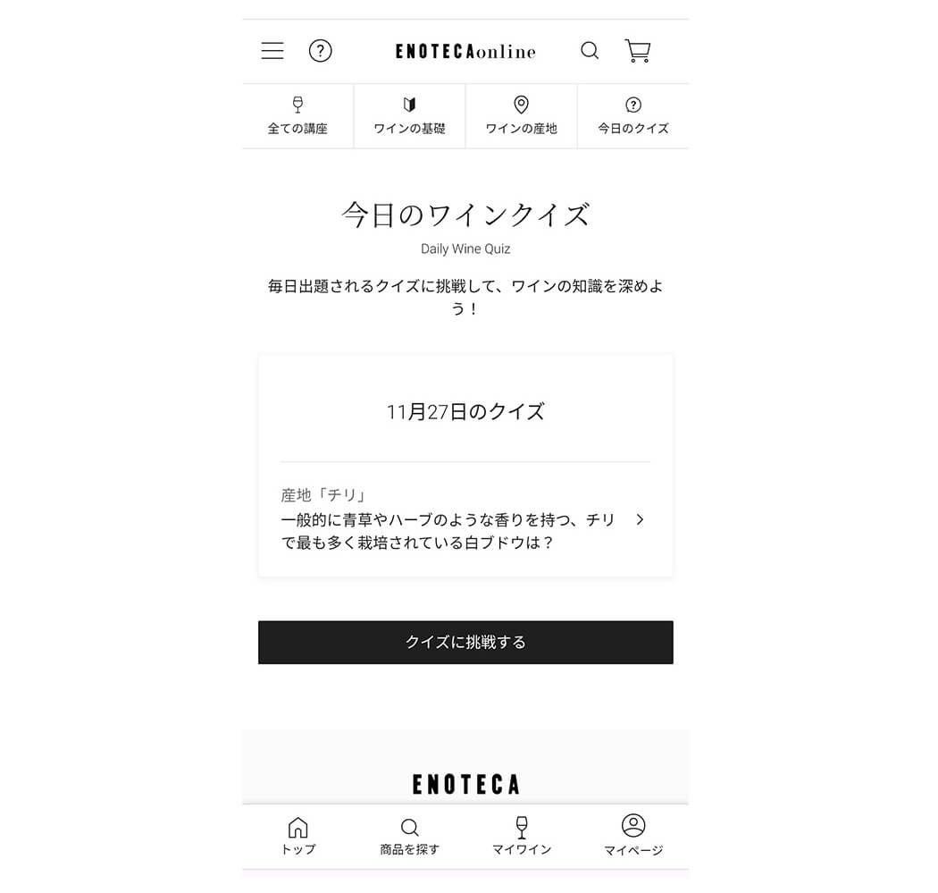 ワインの基礎知識からワイン産地、ぶどう品種、ワインに関する用語など、「産地講座」と「ワインの基礎講座」で出題されたワインに関する知識クイズを、毎日日替わりでランダムに出題します。各講座を受講しなくても、クイズ単体で楽しみながらワインについて学べます。