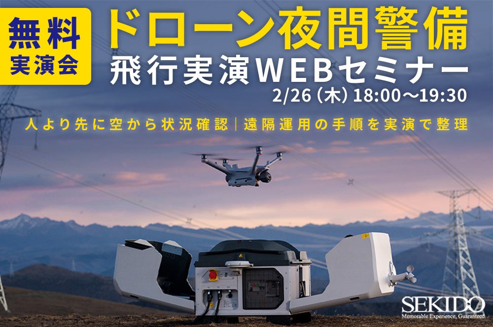 DJI(ディージェイアイ)正規販売代理店としてドローンビジネスの最前線を支える株式会社セキド(本社:東京都港区、代表取締役:大下貴之)は、深空株式会社(本社:大阪府大阪市、代表取締役社長:LIU WENHUI)と共催で、オンラインイベント「【遠隔操作】ドローン夜間警備 飛行実演WEBセミナー」を2026年2月26日(木)に開催します。夜間警備でのドローン活用を検討する方に向けて、遠隔運用を前提とした運用フローと実演デモを、導入判断に必要な観点で整理できる内容です。
