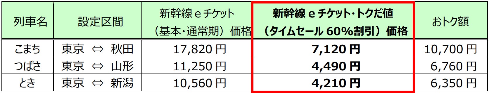 ○今回は秋田新幹線「こまち」、山形新幹線「つばさ」、上越新幹線「とき」限定で、えきねっとから新幹線 e チケットで購入すると60%割引となるおトクな商品を期間限定で発売します。