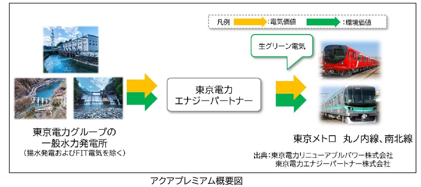今回、東京メトロは東京電力エナジーパートナー株式会社(以下、「東京電力EP社」)が提供する水力発電由来の電力を供給する再エネメニュー「アクアプレミアム」を導入することで、丸ノ内線・南北線で使用する全ての電力を再エネ化します。