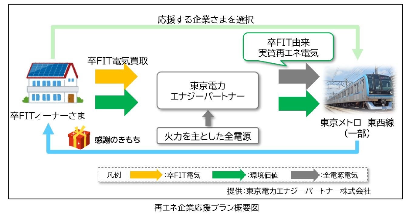 電した余剰電力に含まれる環境価値を、東京電力EP社を通じて東京メトロへ提供するプランです。その環境価