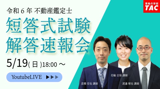 不動産鑑定士、宅建士、司法書士、日商簿記検定、公認会計士、公務員などの資格取得に向けた教育サービスを展開しているTAC株式会社(東京都千代田区、代表取締役社長:多田敏男)は、5/19(日)実施の不動産鑑定士試験短答式試験の解答速報会を、5/19(日)18:00からYouTube Liveにて開催いたします。