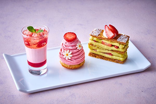 木苺のクーリと苺のムースにライム&ローズマリーのジュレを重ねた、さっぱりテイストの「苺のヴェリーヌ」、ピスタチオタルトの上に柚子風味のマスカルポーネムースをのせ、甘さ控えめの苺クリームでコーティングした「苺のモンブラン」、ピスタチオのカスタードクリームと苺のスライスをサクサク生地でサンドした「苺のミルフィーユ」の3種をご堪能いただけます。