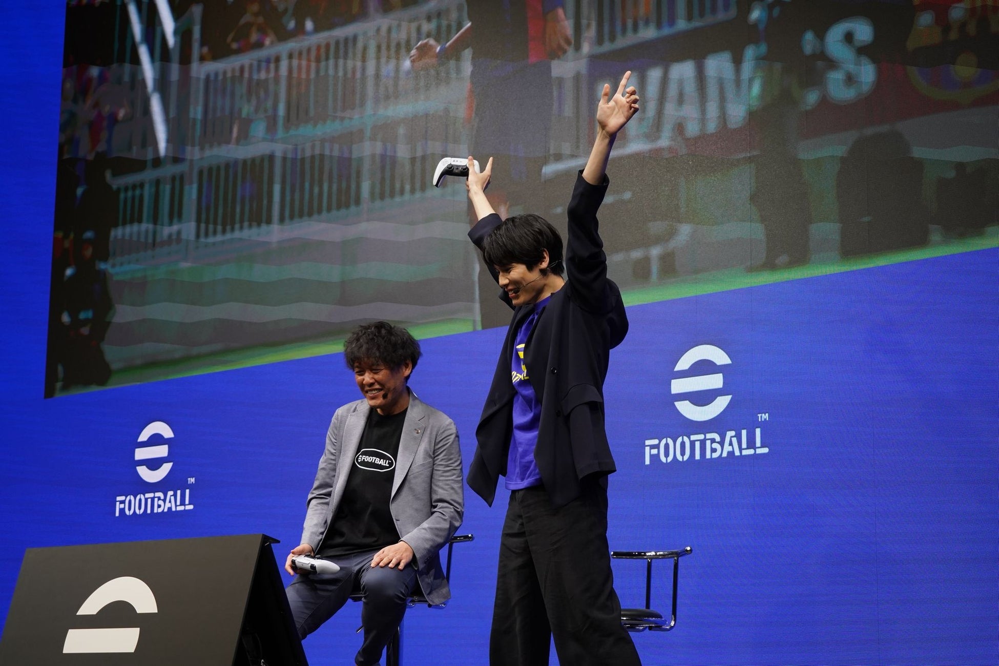 『eFootball™』Tシャツを着てKONAMI本社(コナミクリエイティブセンター銀座)へ会社訪問をしたエピソードのほか、地方での撮影にPlayStation®5を持ち込み『eFootball™』をプレーしているというエピソードも暴露され、「1日さぼると取り返すのに何日もかかるんです。泊まり込みの撮影で、2か月間ほどプレーできないのは考えられないので、リュックにPlayStation®5を入れて持ち運んでいます」と語りました。