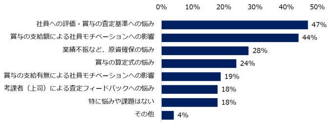 続いて、昨年よりも減額する企業に、どのくらい減額するかを伺うと「15%以上」(25%)が最多でした。減額する理由については「業績不振」が75%で最も多い回答となりました。また、社員への賞与支給に関しての悩みや課題を伺いました。トップは「社員への評価・賞与の査定基準への悩み」(47%)でした。具体的な悩みの声を紹介します。