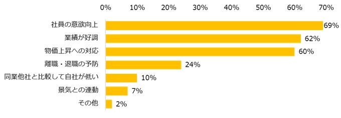 昨年よりも今年の冬季賞与を増額する企業に、どのくらい増額するかを伺うと「1%~3%未満」(31%)が最多。増額する理由上位は「社員の意欲向上」(69%)、「業績が好調」(62%)、「物価上昇への対応」(60%)でした。