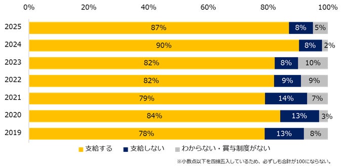 2025年、冬季賞与を支給するかを伺うと、87%が「支給予定」と回答。昨年と比較すると、支給予定の企業は3ポイント減少しました(2025年:87%、2024年:90%)。
