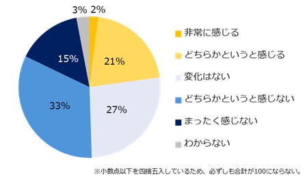 昨年と比較し、景気の上昇や回復を実感できているかを伺うと、48%が「感じない」(どちらかというと感じない:33%、まったく感じない:15%)と回答しました。景気の上昇や回復を「感じる」と回答した企業は23%に留まりました(非常に感じる:2%、どちらかというと感じる:21%)。