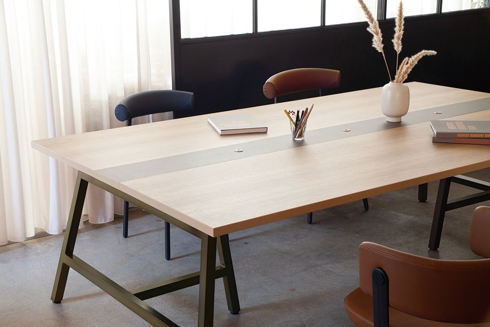 テーブルのセンターには、⾰製品の製造⼯程での端材を再利⽤したUP-BORN LEATHER(アップボーンレザー)を採用。新たな価値を持って⽣まれ変わったサステナブル素材です。