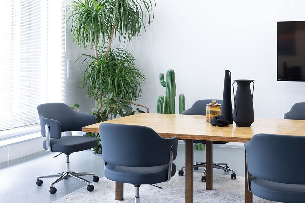 座面の回転機能やキャスター脚など、ワークチェアとしての機能を有しながらも、上質なオフィス空間を演出するデザインです。執務室や会議室でのデスクワークに適したタスクチェアです。