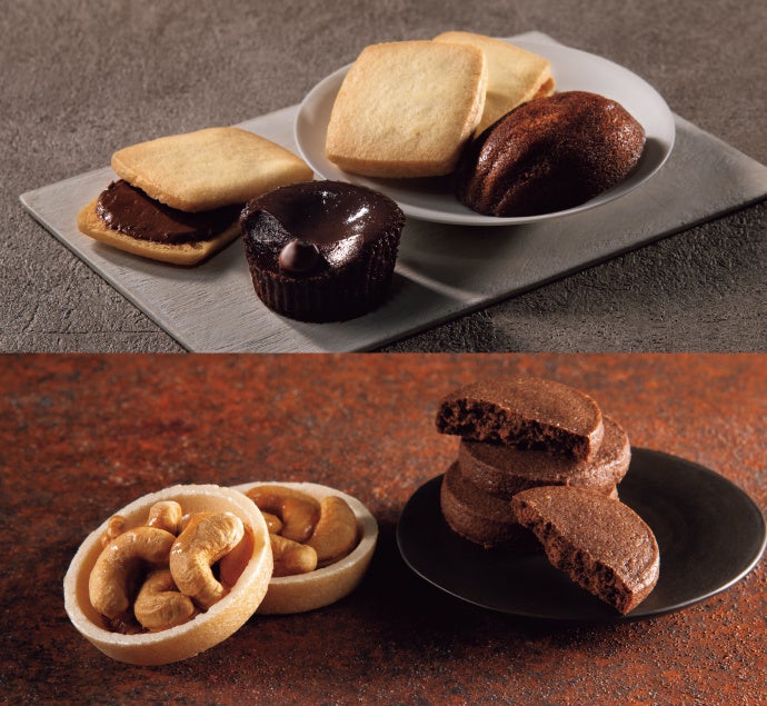 カリッと香ばしいキャラメリゼしたカシューナッツをのせたモナカと、芳醇なカカオのサクサク食感クッキーのアソート。