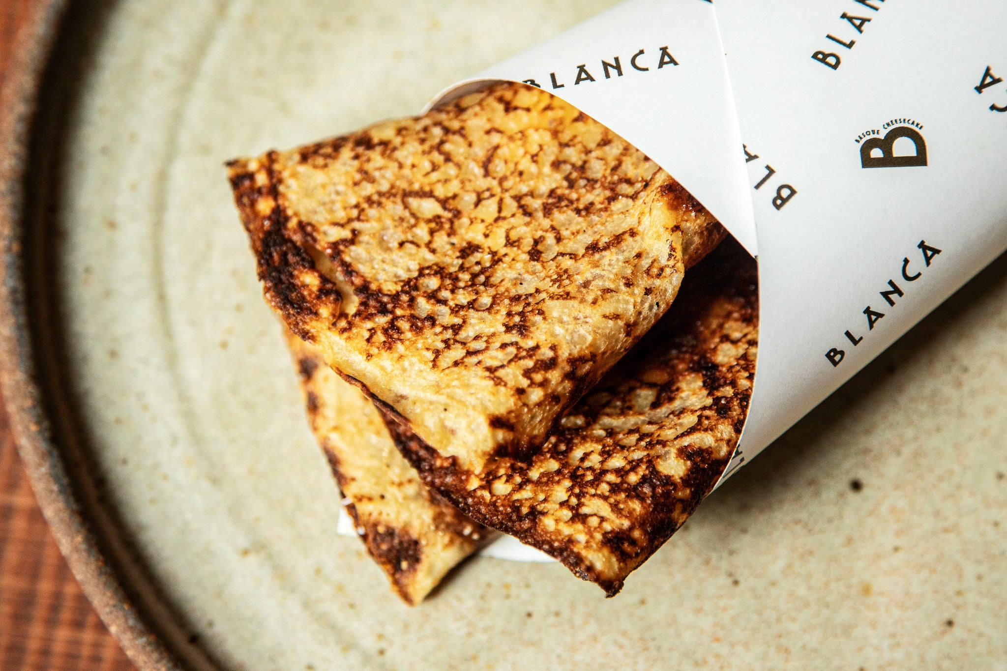 パリパリ新食感!店内で1枚ずつ丁寧に焼き上げる、焦げを楽しむ新スイーツ「BLANCA Crepe (ブランカクレープ)」。あえて焦がした香ばしい生地は、日本橋兜町のチョコレート&アイスクリームショップ「teal (ティール)」、カカオのラボ「nib (ニブ)」などの人気店を手掛けるトップパティシエ眞砂 翔平氏が監修を務め、このたびBLACA東 鉄雄とのコラボメニューが実現。