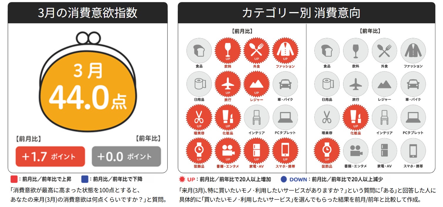 「春支度消費」に対する意欲の高まりから消費意欲指数は前月比増も、前年に引き続き3月としては低い水準に