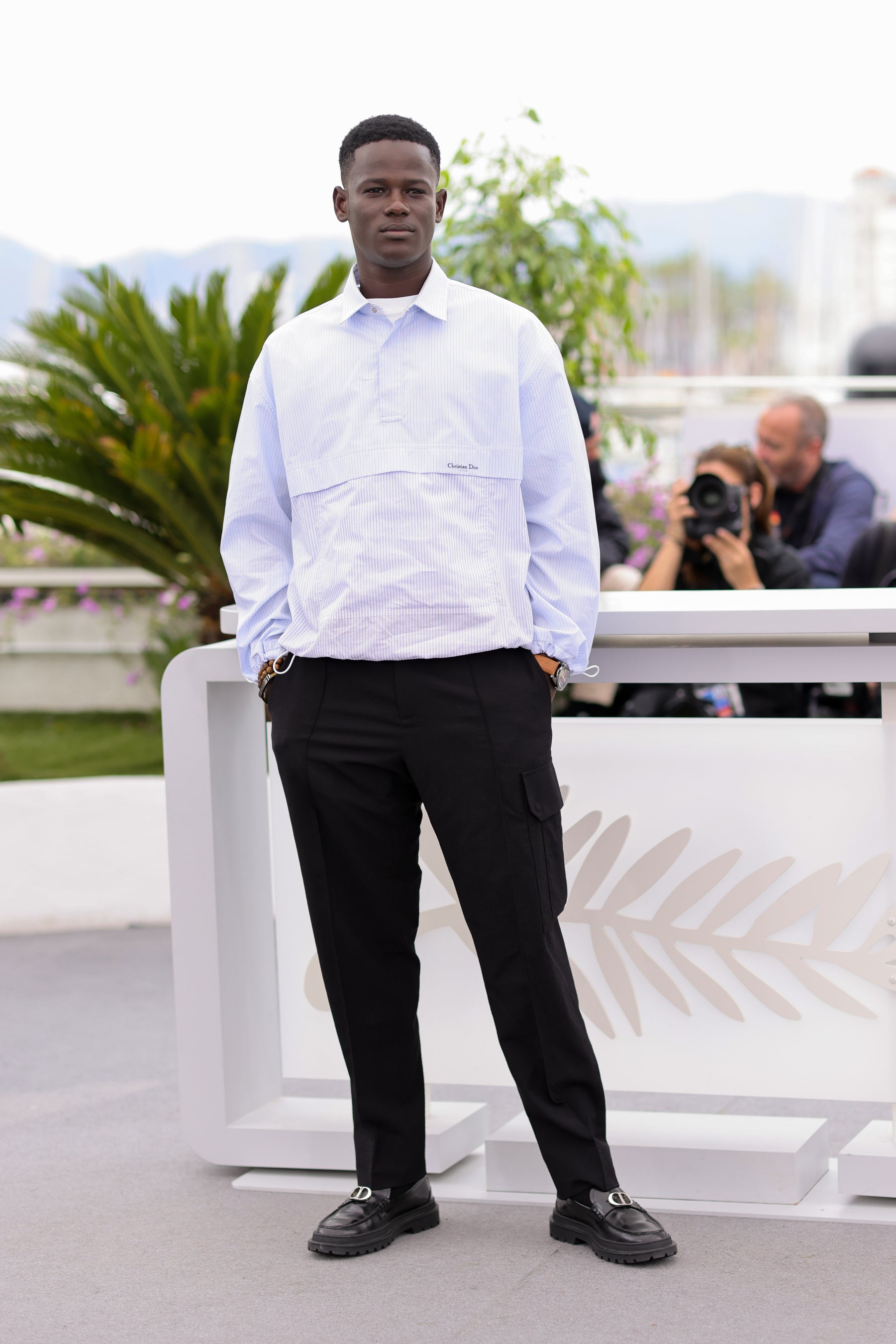 ママドゥ・ディアロは、ストライプのプルオーバーシャツにブラックウールのパンツとブラックレザーの「ディオール エクスプローラー」ローファーを合わせた装いで登場。