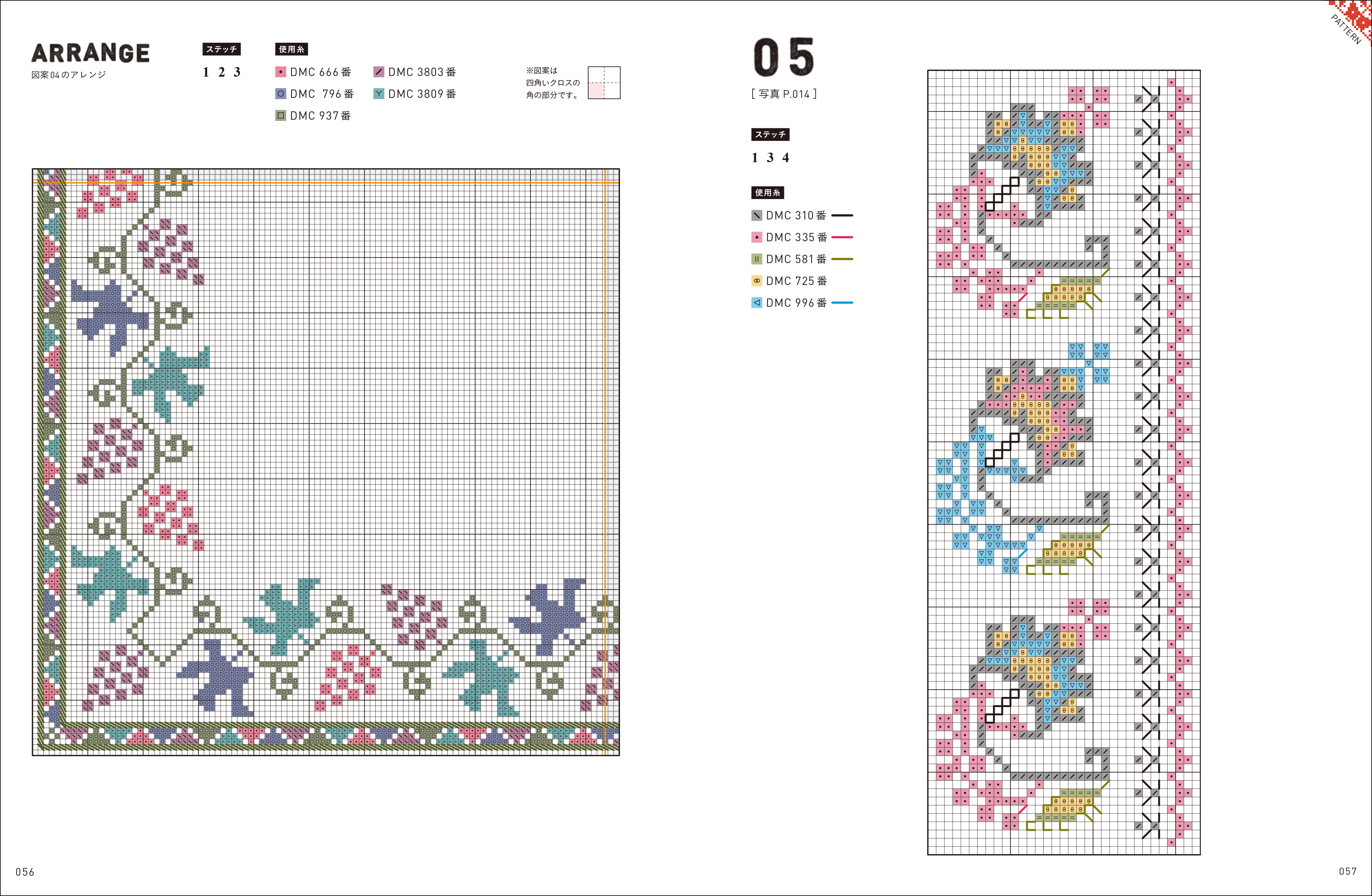 本書ではクロスステッチを中心とした、布の織り目を数えて規則的に刺すカウント刺繍で構成された図案をふんだんに収録しました。