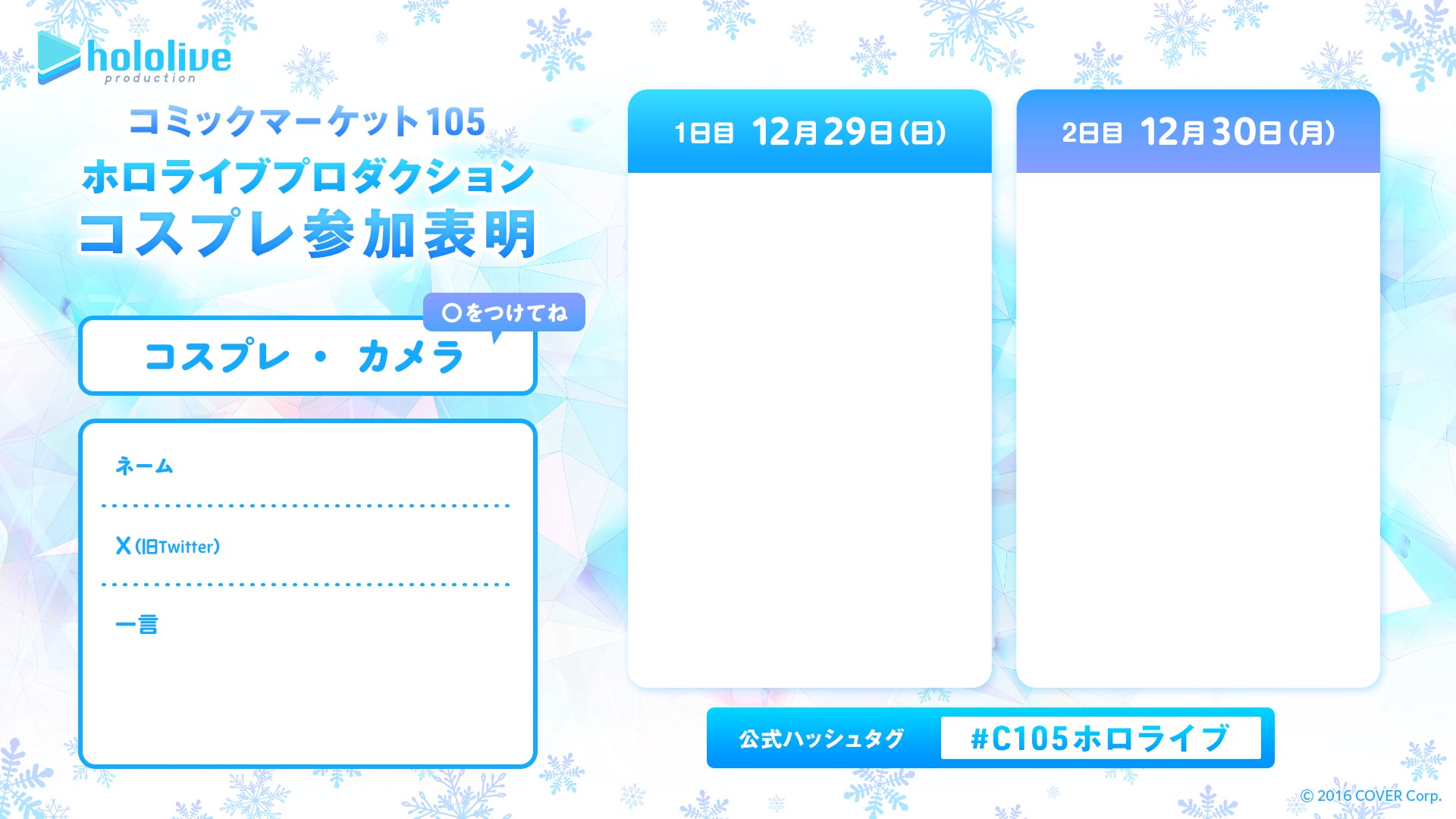 ハッシュタグは「#C105ホロライブ」となりますので、みなさまのコスプレ活動にぜひご活用ください!