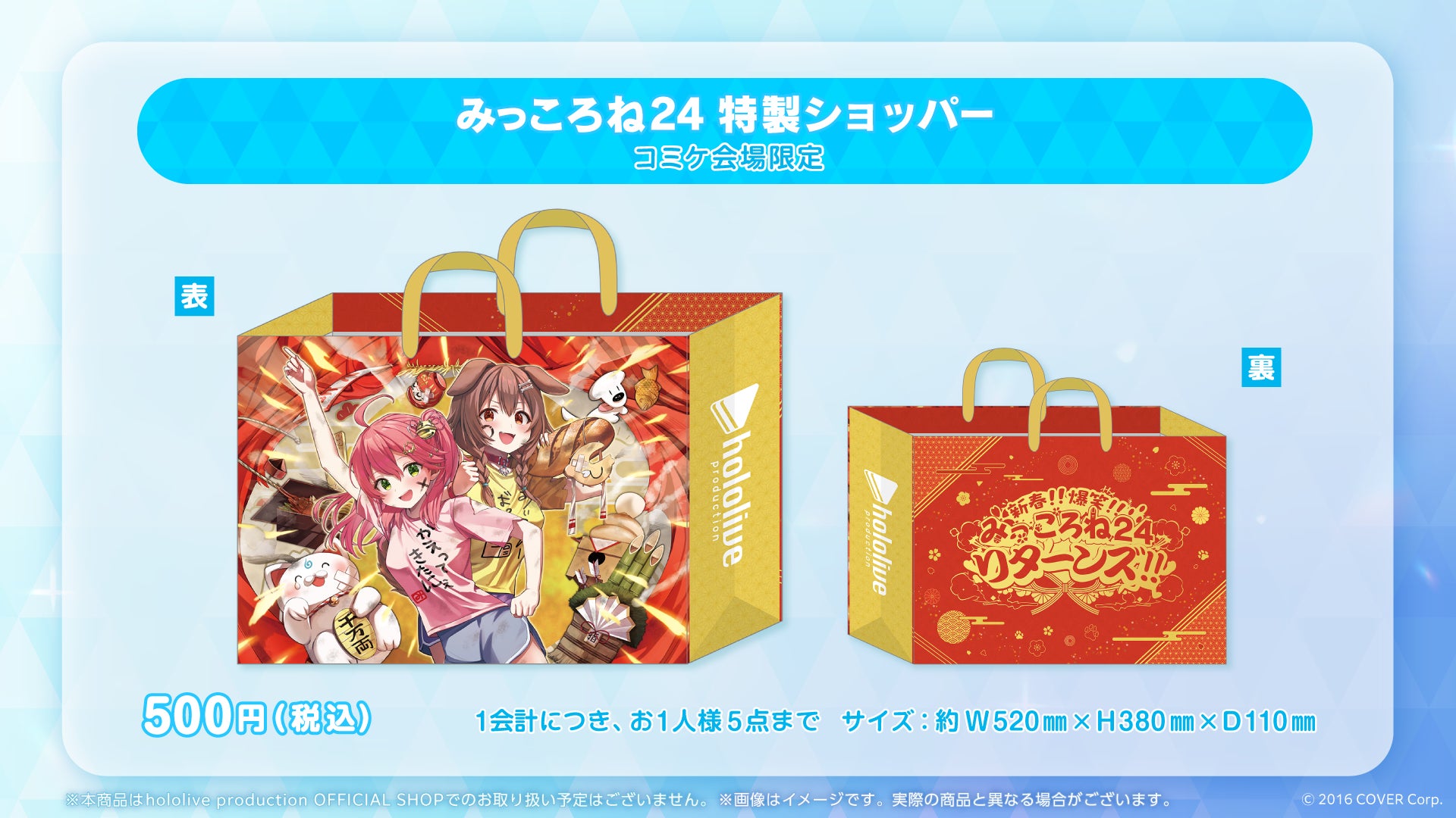 『コミックマーケット105』では、ホロライブプロダクションの『ボイス』企画KVを使用したC105オリジナル商品や『みっころね24 特製ショッパー』、『ホロライブ・オルタナティブ』グッズ、『hololive friends to Go』などの販売を予定しております。