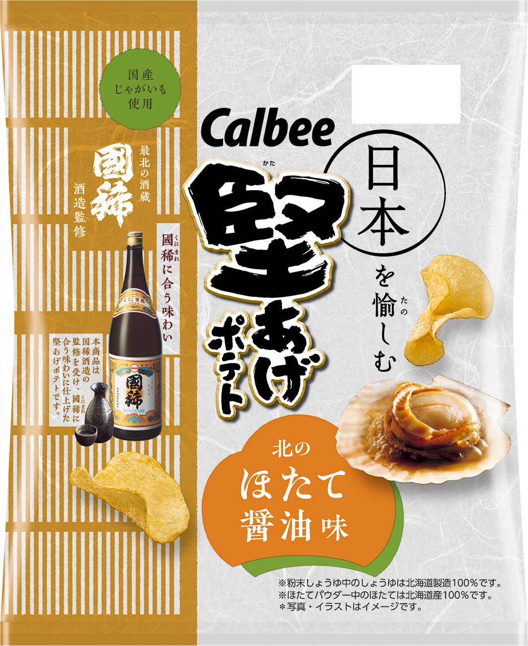 伝統食材や素材をお菓子を通じて発信する「日本を愉しむ」プロジェクト第5弾!日本最北の酒造「国(くに)稀(まれ)酒造」監修!道産素材を使った日本酒にぴったりな味『堅あげポテト ほたて醤油味』