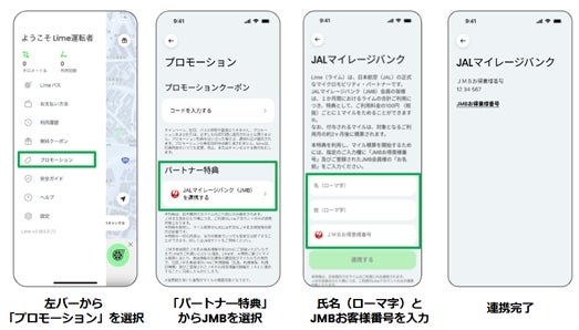 ・Limeを利用するたびに、JALのマイルが100円につき1マイルたまります。