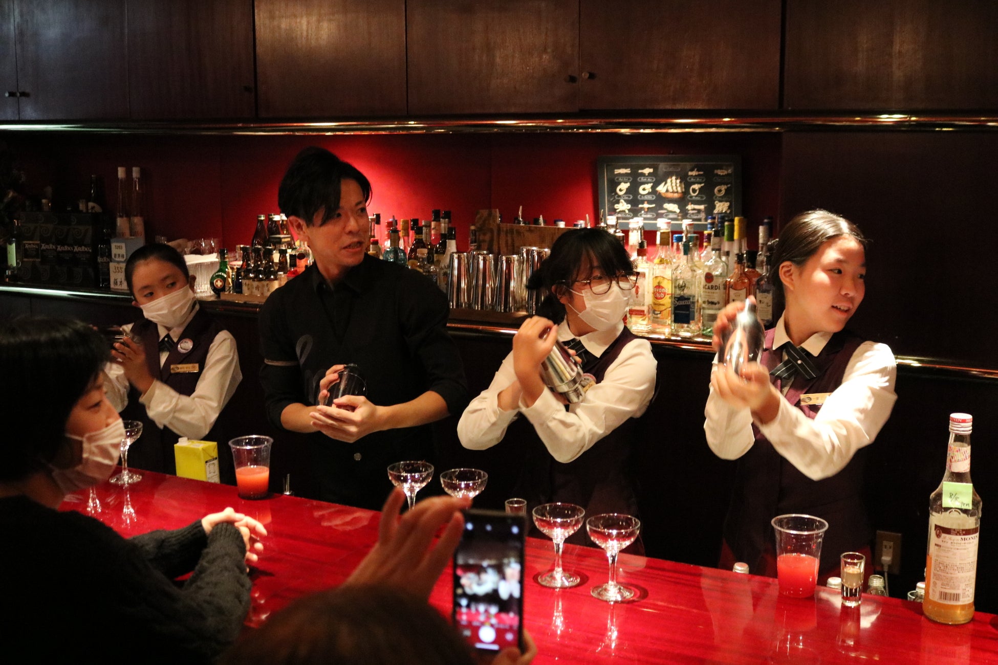 バーカウンターに立って、ジュースを一生懸命シェイク!三色のノンアルコールカクテルを作ります。完成したドリンクは保護者と一緒に召し上がっていただきます。