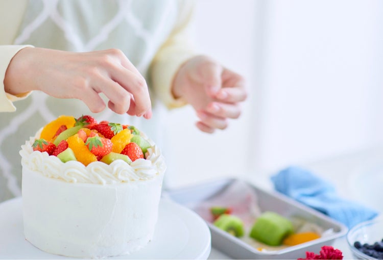 3人一組になって、スポンジケーキに生クリームを塗って、お好みのフルーツなどで色鮮やかに飾りつけ!完成したケーキはランチブッフェで保護者と一緒に召し上がっていただきます。