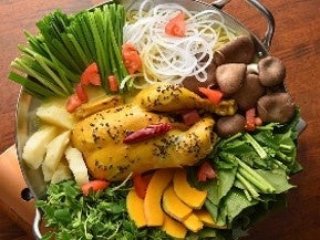 鶏1羽を丸ごとお鍋に使っており、コラーゲンが染みでた出汁と共に、もも肉、むね肉、手羽元、手羽先、ささみまで、全ての部位が食べられます。鶏を丸ごと煮込んだ濃厚な白湯スープにヒマラヤの黒岩塩とネパール産のオーガニックなウコンやスパイス、ハーブで仕上げてある出汁スープは意外とあっさりした優しい味わい。ウコンの黄色い色味から「カレー鍋」を想像される方がいますが、よくあるカレー鍋ではなく、一口食べたら体に染み入るヘルシーさを実感できると好評です。
