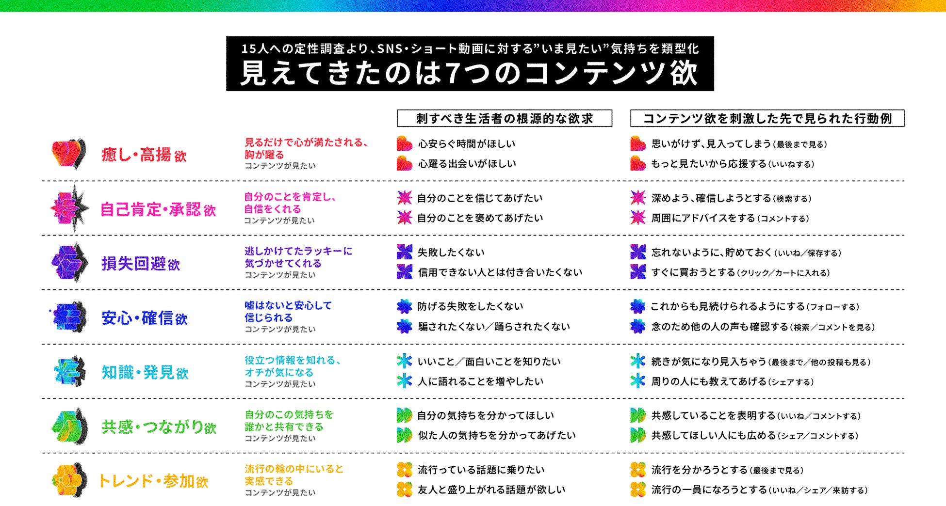 生活者がタイムライン上で指を止め、「いま見たい」と感じる背景には、以下の7つの根源的な欲求があることが見えてきました 。