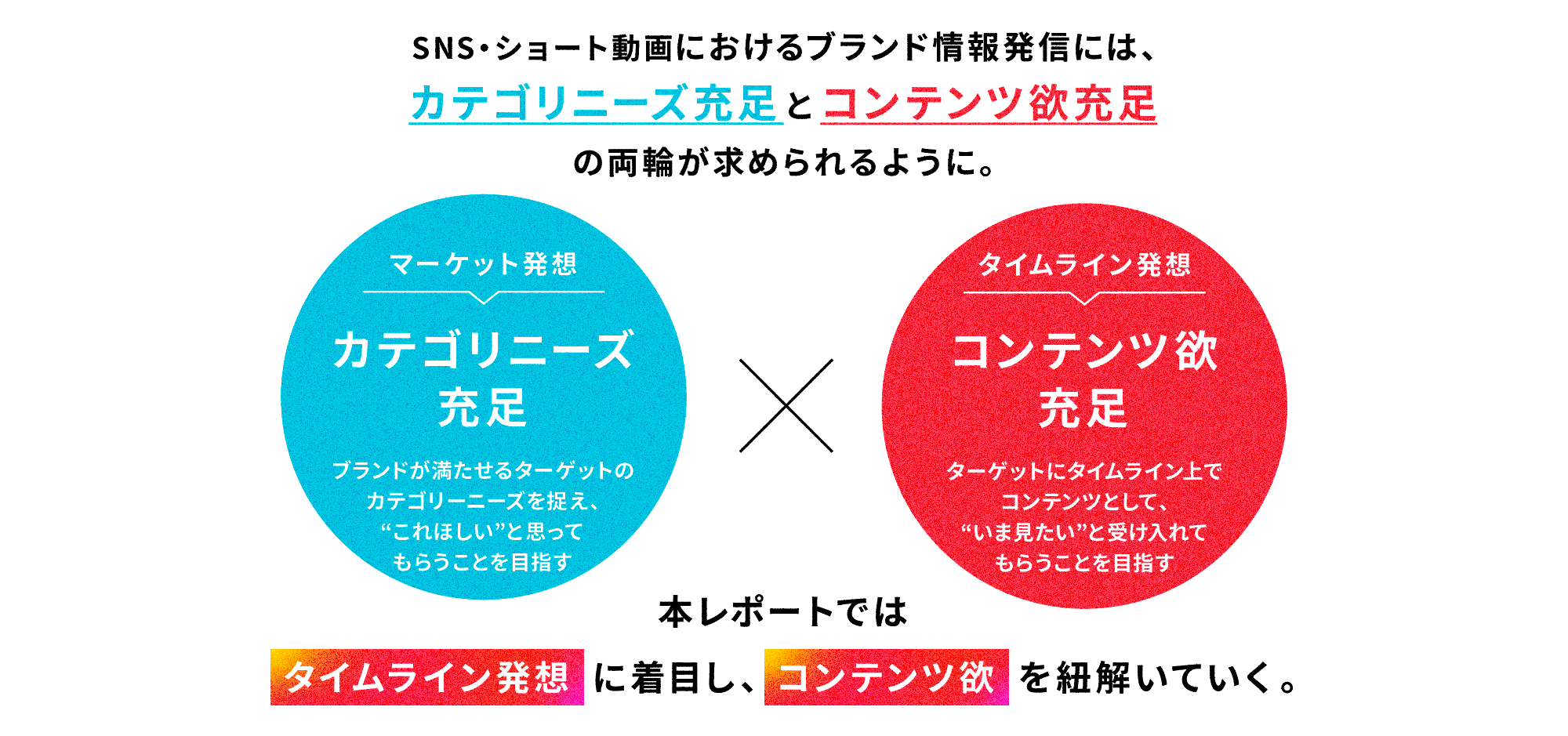 こうした中で求められるのは、従来の「カテゴリニーズ」を満たすマーケット発想に加え、生活者がタイムライン上で“いま見たい”コンテンツは何かを起点にする「タイムライン発想」です。企業が「伝えたい話」をするのではなく生活者がタイムライン上で「いま見たい」と感じるコンテンツ欲を満たすことが重要となります。