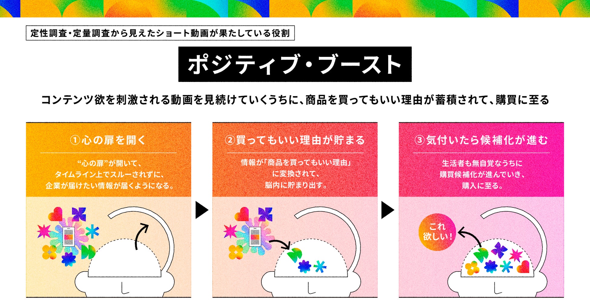生活者は、コンテンツ欲が満たされると、ブランドに対して“心の扉”が開き、最初は興味がなかったブランドに対しても親近感が芽生え始めます。動画を通じて「買ってもいい理由」が自然と蓄積されていくことで、生活者自らがポジティブな感情を高め、「思いがけず購入した」という予定外の購買(ポジティブ・ブースト)を引き起こすトリガーとなります 。
