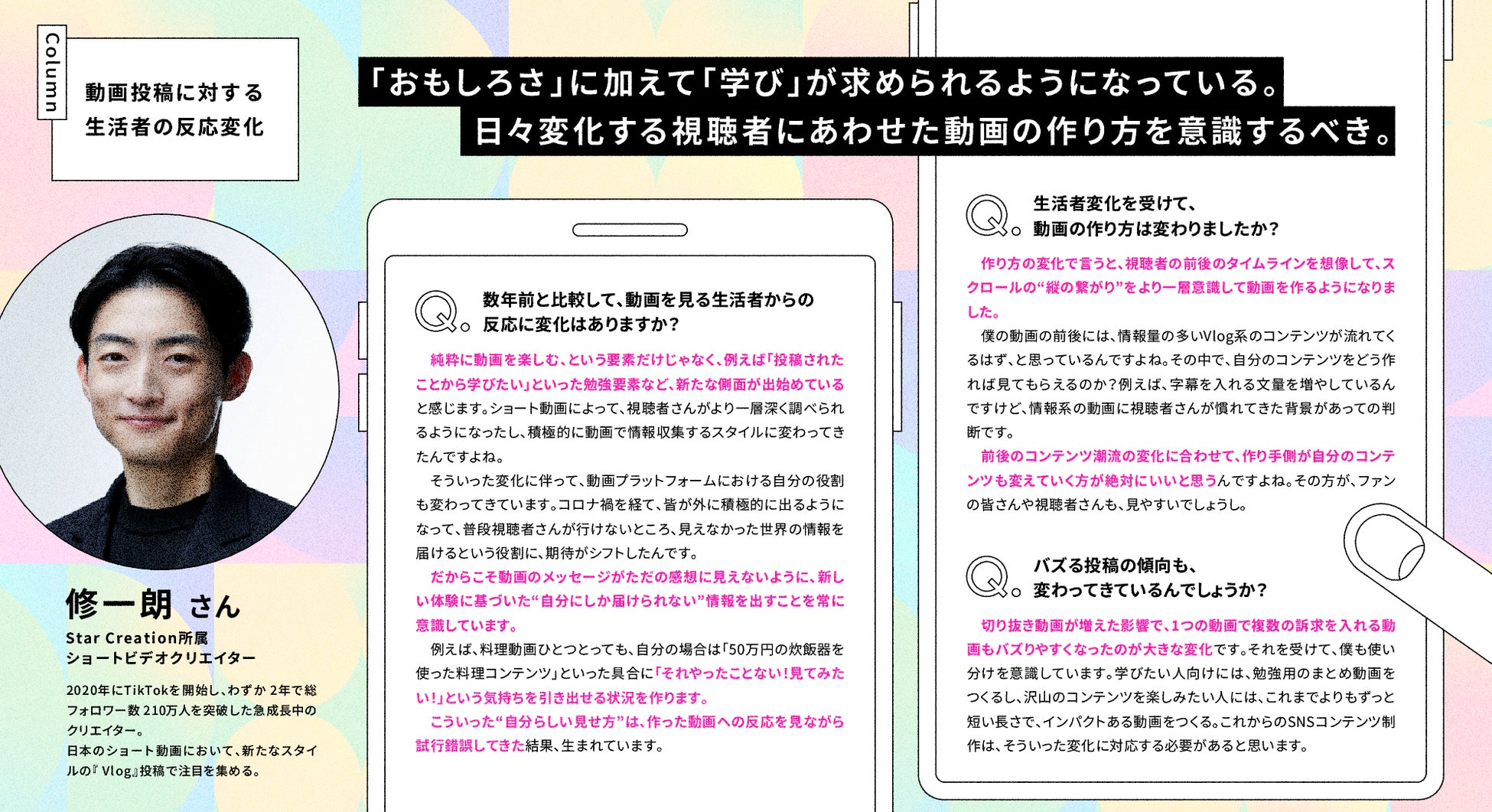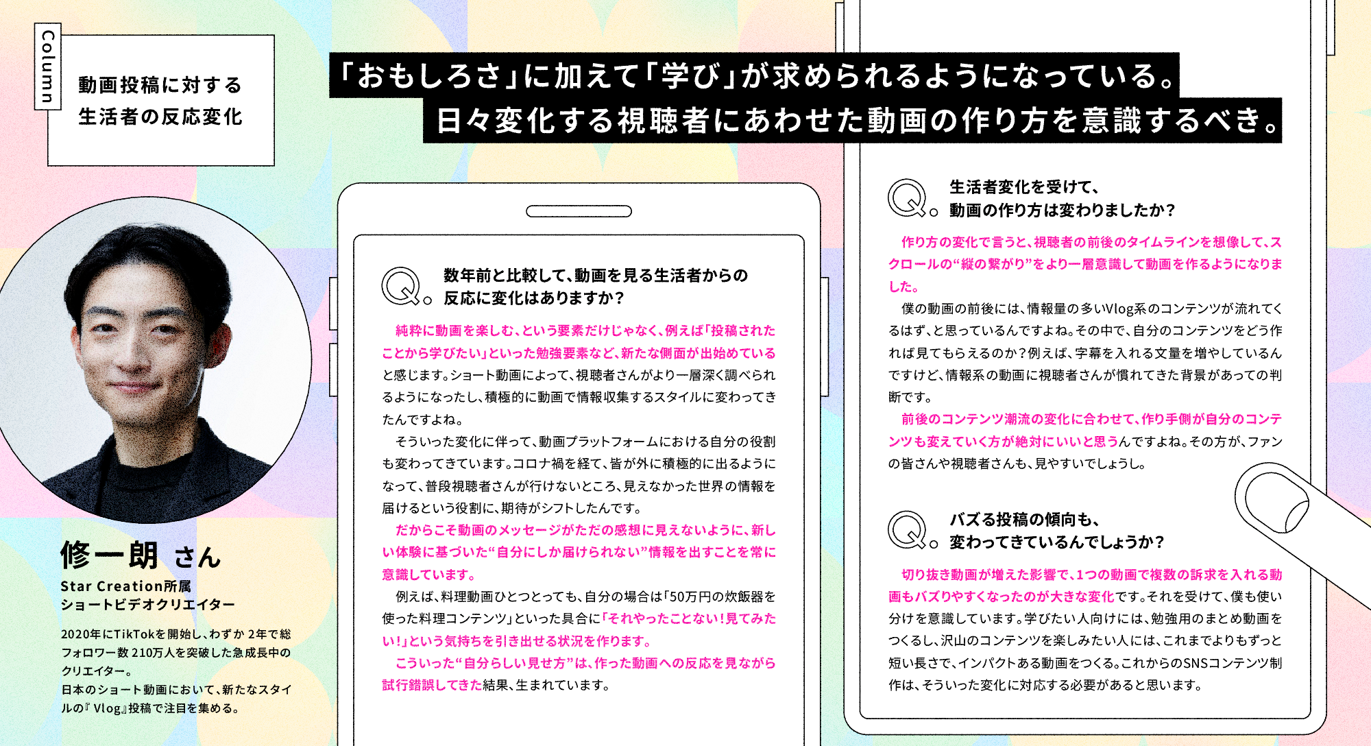 本レポートでは、ショートビデオクリエイターの修一朗さん、神堂きょうかさんに行った、SNS・ショート動画の潮流変化についてのインタビューも掲載しています。クリエイター本人が肌で感じている変化を是非ご覧ください。
