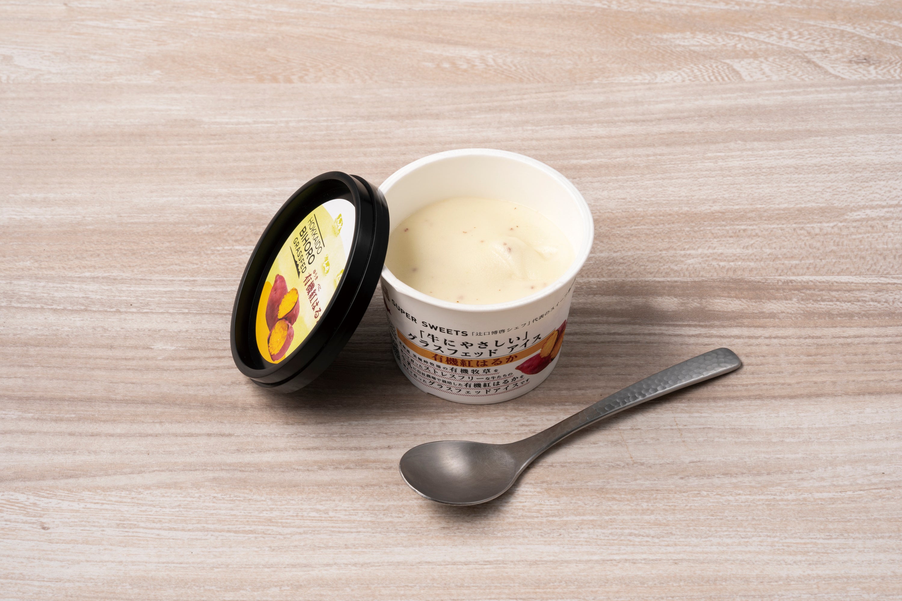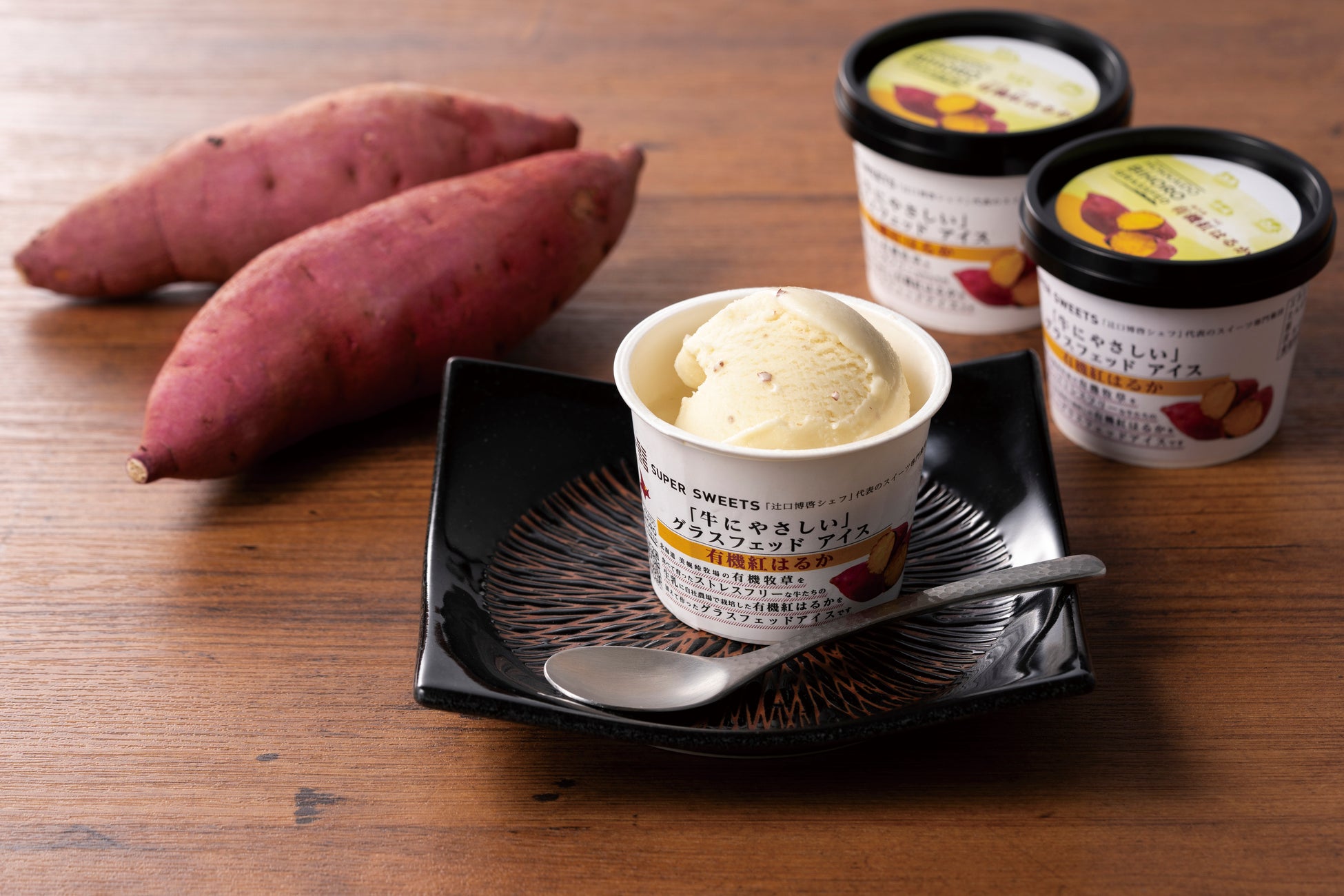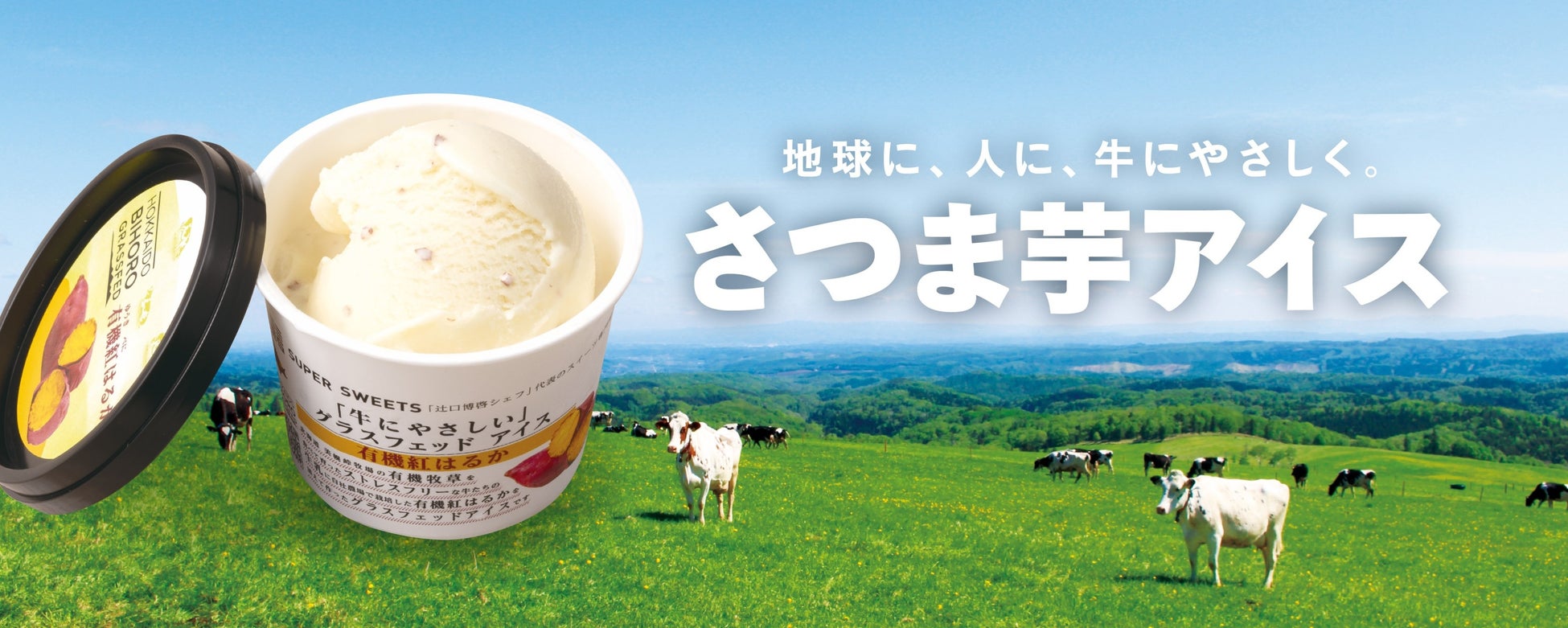 【商品内容】 自社有機農場で栽培している有機さつまいも「紅はるか」を使用。生乳が美味しいグラスフェッドミルクにさつまいもの味わいがプラスされたプレミアムなグラスフェッドアイス