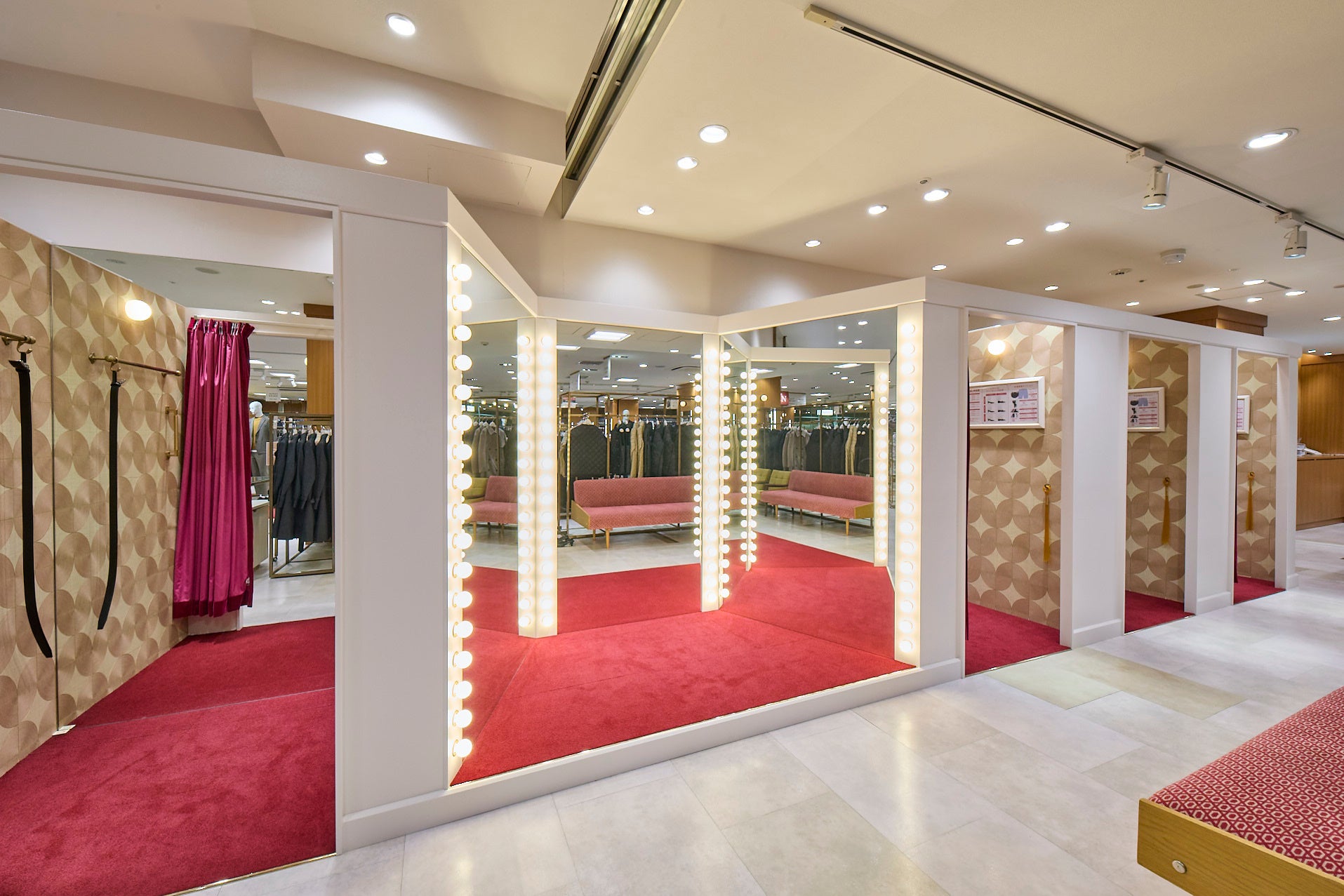 フィッテイングルームにはAOKI店舗で初めて三面鏡を設置。普段ご自身では見ることが難しい背面などさまざまな角度からスタイリングが確認できます。AOKIは商品セレクトからスタイリングまで、スタイリストが隅々までサポートいたします。