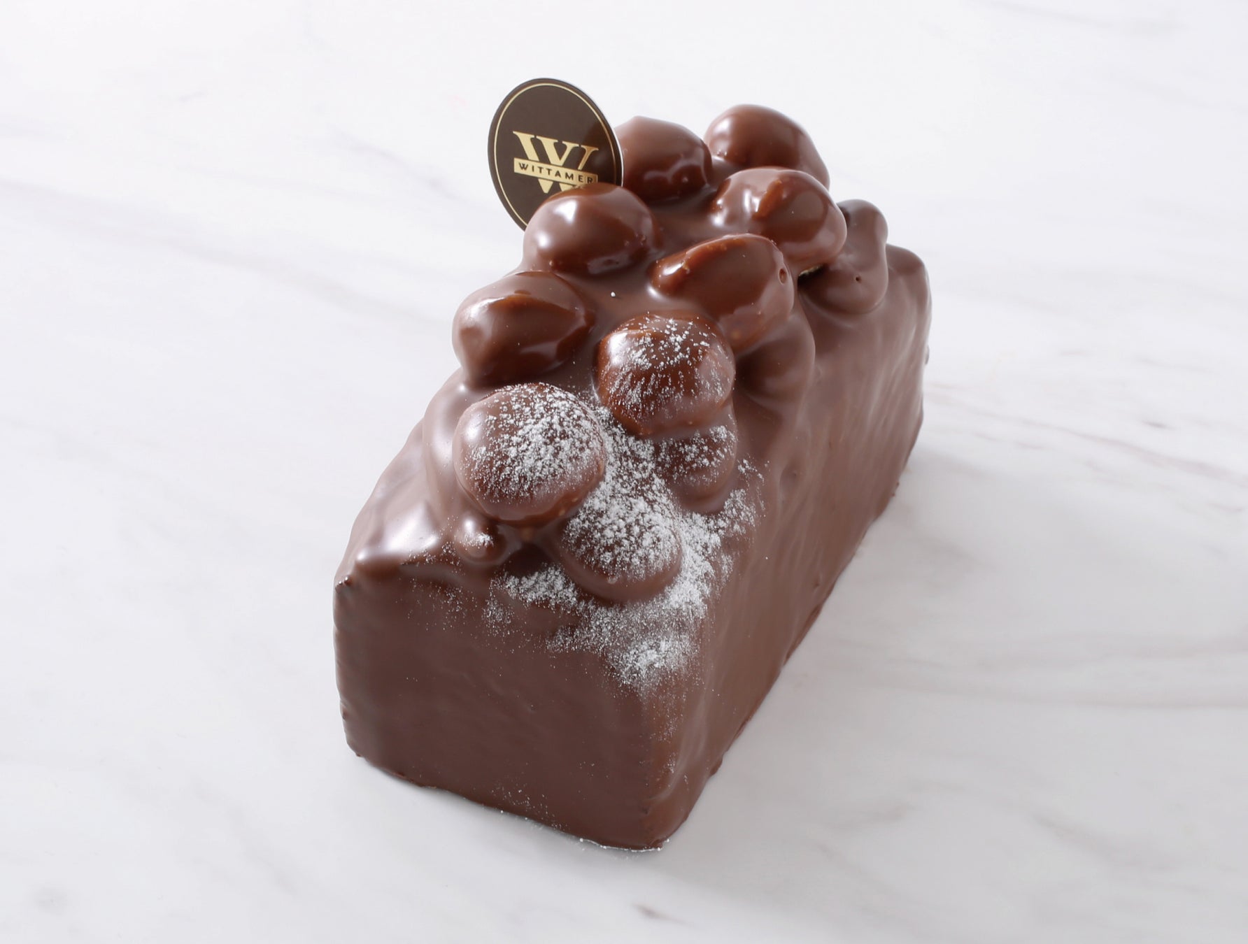 しっとりと焼き上げた濃厚なチョコレート生地に、マカダミアナッツを散らし、口どけまろやかなクーベルチュールチョコレートでコーティングしました。