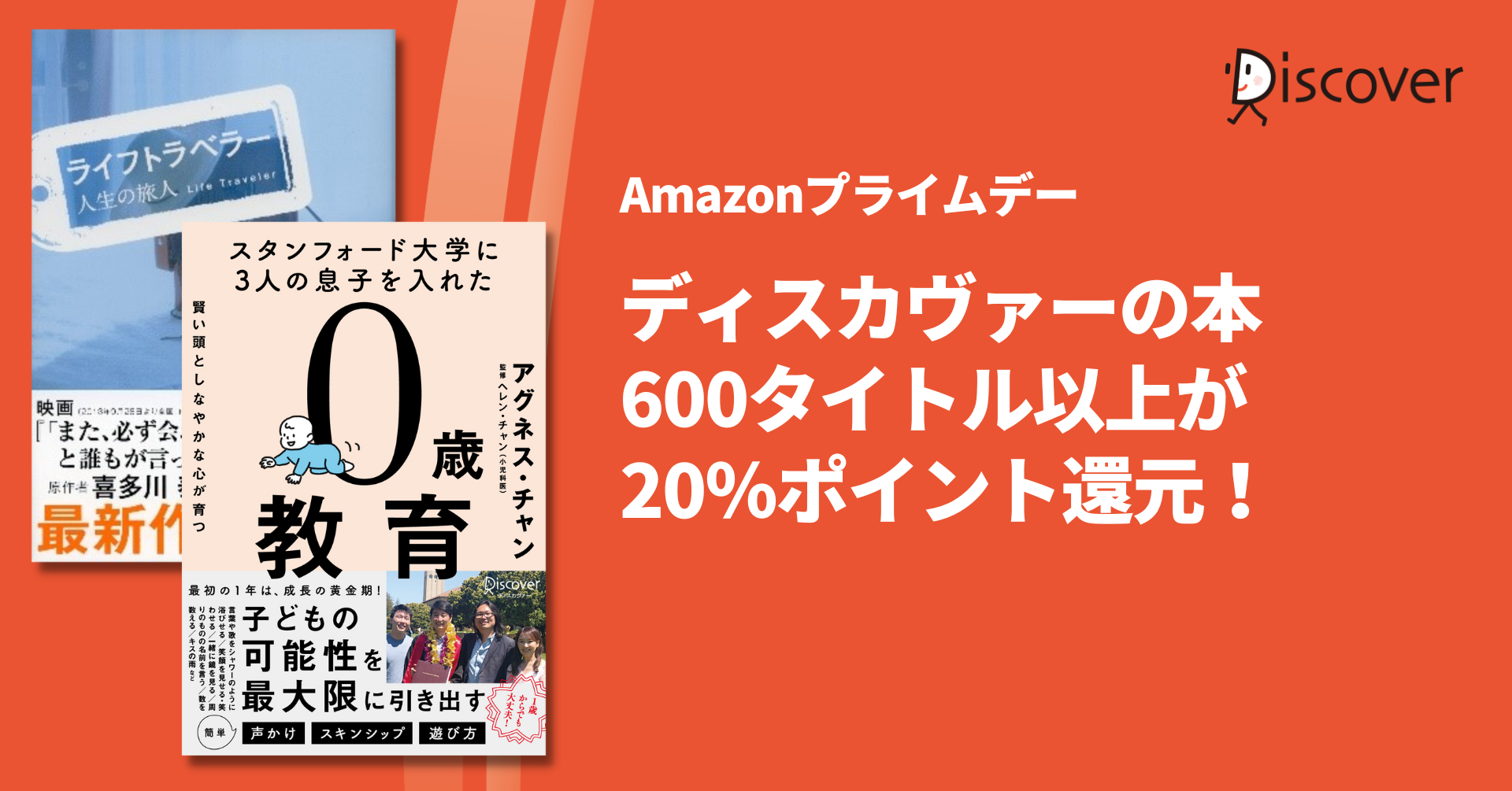 3人の息子をスタンフォード大学に合格させたアグネス・チャンさんの独自の子育て法を紹介した『スタンフォード大学に3人の息子を入れた 賢い頭としなやかな心が育つ 0歳教育』や、著書累計100万部を超える喜多川泰さんの『ライフトラベラー 人生の旅人』など、ディスカヴァーの人気タイトルが多数対象です。
