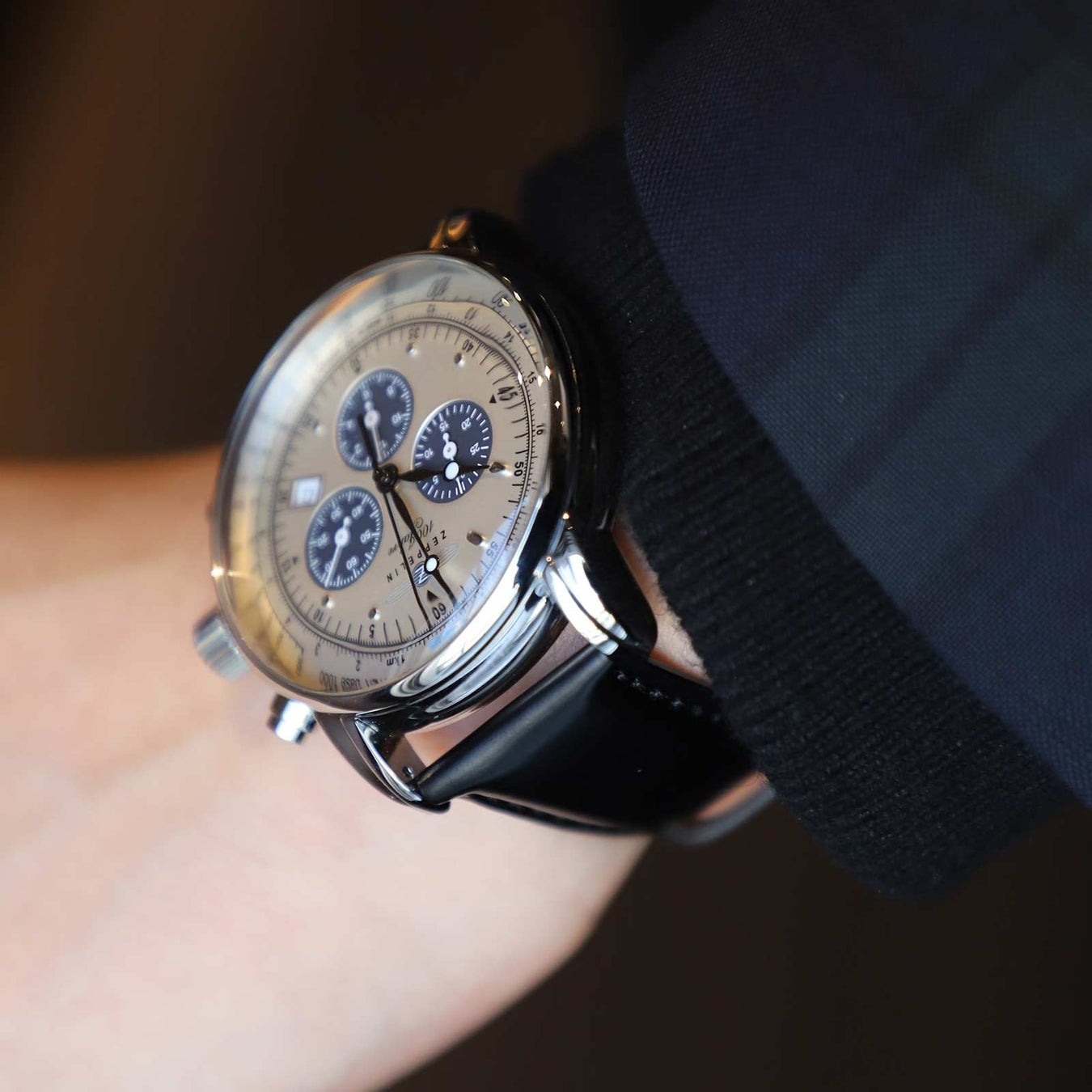 クロノグラフ・24時間表示・秒表示のサブダイヤルはブラック。日本で人気の通称“逆パンダ”デザイン。コードバンベルトのブラックと調和し、上品な腕元を演出します。