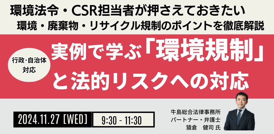 JPI(日本計画研究所)は、牛島総合法律事務所 パートナー・弁護士 猿倉 健司 氏を招聘し、実例で学ぶ「環境規制」と法的リスクへの対応について詳説いただくセミナーを開催します。