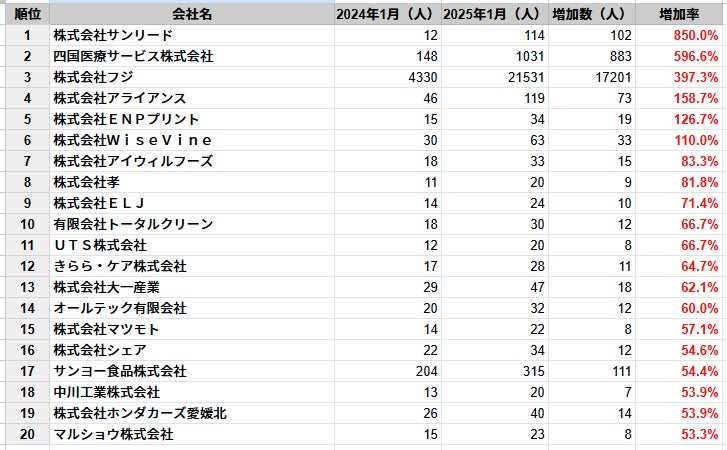 ・2024年1月時点と2025年1月時点の従業員数を比較